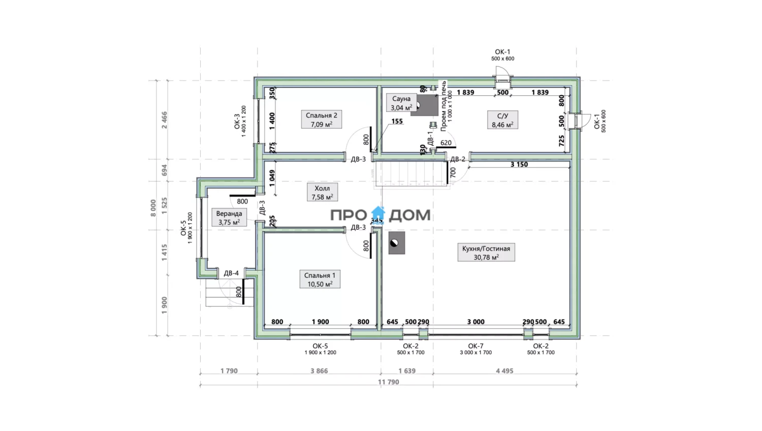 Каркасный дом с мансардой ПМ-270 – прекрасный объект для круглогодичного проживания. Снеговая/ветровая нагрузка уровня делает постройку надёжной в любую погоду. Площадь дома составляет 138 м², что позволит разместить всю необходимую мебель и предметы интерьера. Размеры дома 11.8 x 8.0 м экономят место на участке, чтобы вы могли освоить свободное пространство по своему вкусу.
