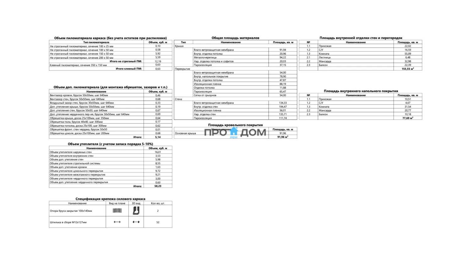 Объем пиломатериала для силового каркаса