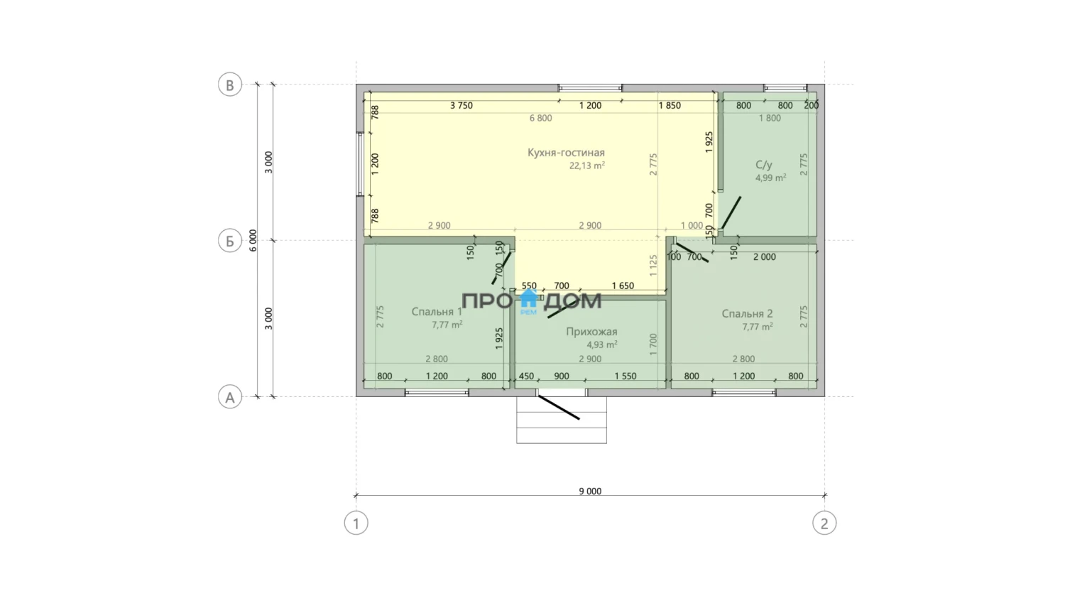 Каркасный одноэтажный дом ПО-376 – прекрасный объект для круглогодичного проживания. Снеговая/ветровая нагрузка уровня 1 этаж делает постройку надёжной в любую погоду. Площадь дома составляет 81 м², что позволит разместить всю необходимую мебель и предметы интерьера. Размеры дома 9 x 6 м экономят место на участке, чтобы вы могли освоить свободное пространство по своему вкусу.