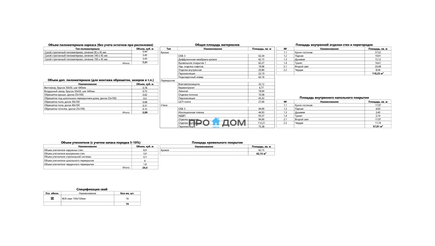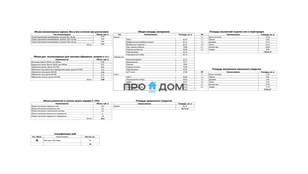 | Внутренние перегородки | каркас из доски с заполнением звукоизоляцией, обшивка черновая либо в один слой под последующую отделку. |