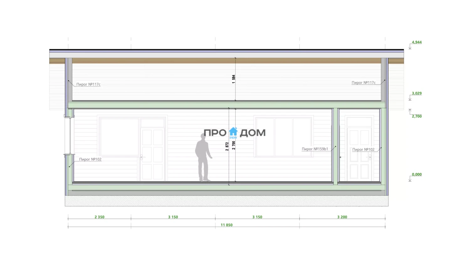 Каркас наружных стен деревянные стойки с проектным шагом, снаружи закрыты ветроизоляцией, внутри — без чистовой облицовки, готовые под отделку.