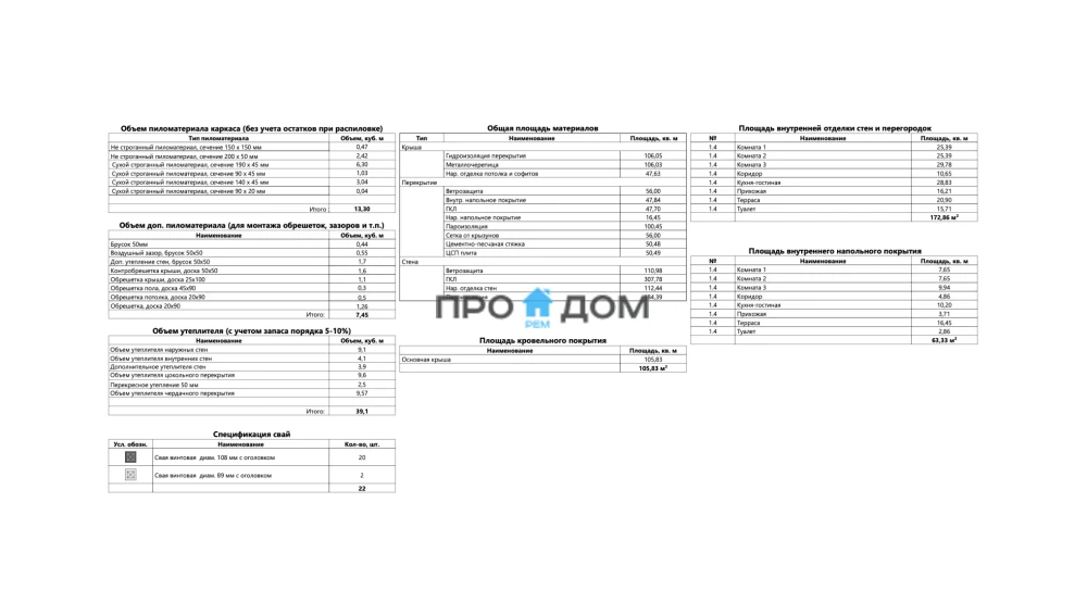 | Кровля | стропильная система с гидроизоляционной мембраной, контробрешеткой и обрешеткой, с монтажом кровельного покрытия по выбранному типу. |